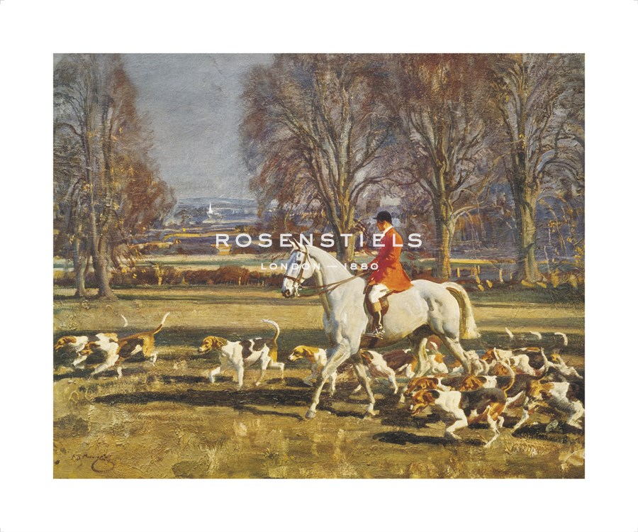 A November Morning is a quintessential fox hunting scene with the composition dominated by the gentleman wearing a scarlet jacket seated upon his grey horse and surrounded by a pack of hounds. The scarlet jackets are worn by gentlemen referred to as Masters of the Hunt and they are traditionally responsible for leading the fox hunt. Munnings was able to accurately portray the movement of horses and hounds in the midst of a hunt due to his personal knowledge and experience of fox hunting and horse racing. The sport of fox hunting began in Britain during the sixteenth century and this traditional sport evidently impacted Munnings life and artwork considerably. A November Morning was hung in the 1931 Royal Academy Summer Exhibition and was one of two hundred and thirty pictures exhibited by Munnings in the Summer Exhibitions throughout his successful career