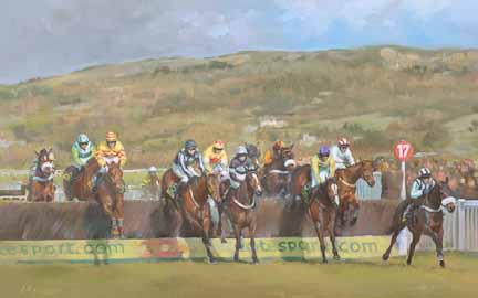 The leaders soar over the final fence in jumping?s most prestigious race, set against a stunning Cleeve Hill.