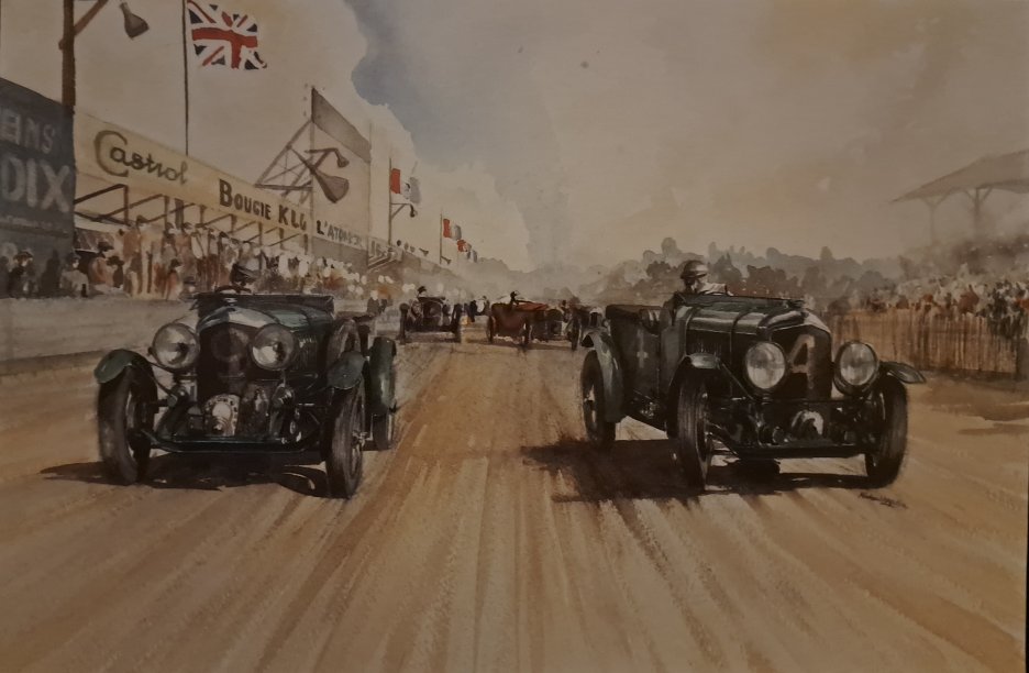 The start of the 1930 Le Mans 24 hrs, the eventual winning Bentley Speed 6 (Car No.4) driven by Woolf Barnato and Glen Kidston is alongside the Bentley 4.5L ‘Blower’ of Birkin and Chassagne.