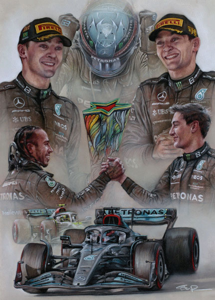 A montage celebrating George Russell winning the 2022 Brazilian GP, his maiden victory in F1.