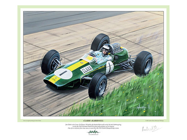 Jim Clark in his Lotus 33-Climax V8 tackles the banked Karussell on the 14 mile Nürburgring to win the 1965 German Grand Prix from pole position. One of six victories from nine races to earn him the 1965 World Championship crown.