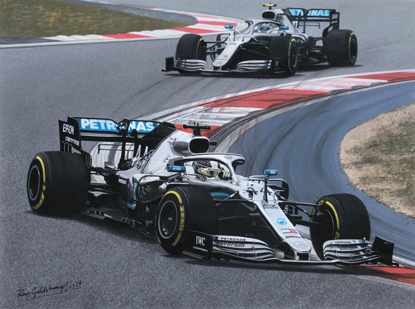 This limited edition print by motorsport artist Ray Goldsbrough shows Mercedes driver Lewis Hamilton leading teammate Valtterri Bottas