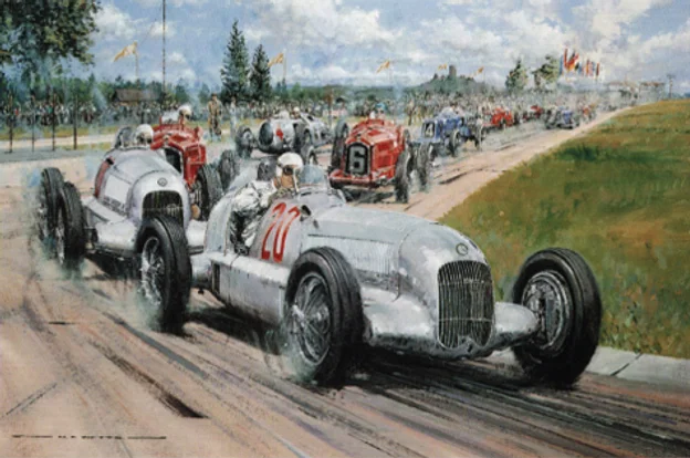Manfred von Brauchitsch leads Luigi Fagioli, both in Mercedes W25A’s at the start of the 1934 Eifelrennen. Initially the cars had been painted white, but exceeded the new 750Kg weight limit. The decision was left to Alfred Neubauer who ordered the mechanics to strip the paint from both cars. Hence the ‘Silver Arrows’ were born. Manfred von Brauchitsch went on to win the race, defeating opposition from Auto Union, Ferrari, Maserati and Bugatti.