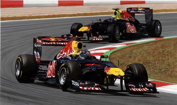 This limited edition print shows Red Bull drivers Sebastian Vettel and Mark Webber in action at the 2011 Spanish Grand Prix.