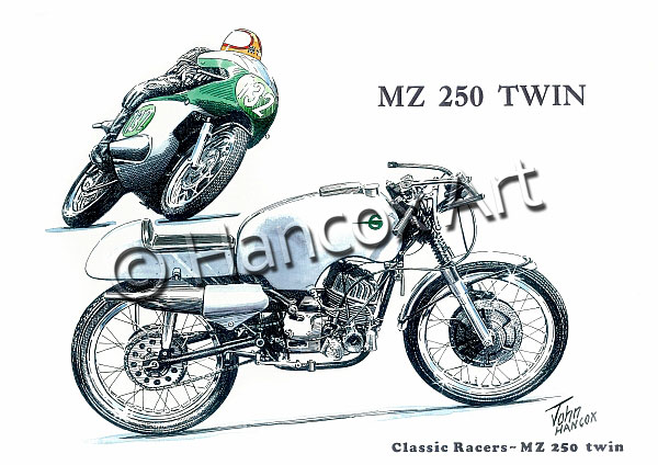 The MZ 250 Twin was raced with both air and water cooled versions of it’s 250cc two-stroke engine, famously developed by German engineer Walter Kaaden. The MZ 250 Twin achieved varying degrees of success and was campaigned by some notable riders including Mike Hailwood (pictured) who rode his MZ to victory in the 1963 East German 250cc Grand Prix!