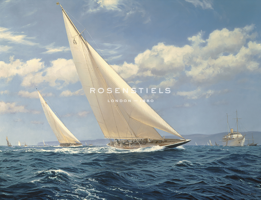 This painting features Endeavour, one of the greatest British racing yachts of the pre-war era. Endeavour joined the racing circuit in 1934 in order to ‘tune up’ for her planned attempt at the America’s Cup. However, the racing at these regattas was not serious enough to provide a real test of the yacht’s ability, so her owner, Sopwith, arranged a private contest at Torbay with the only other ‘J’ Class able to provide real competition. Although Velsheda was fast, she proved to be no match for Sopwith’s new yacht. Subsequently Endeavour raced for the Americas Cup itself in Rhode Island against Rainbow, the American defender. Close, but ultimately unsuccessful, Endeavour was actually the only British ‘J’ Class to come close to taking the Americas Cup from the Americans.